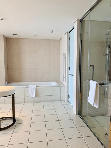 The Ocean View Corner Junior Suite delivers what might be called the very essence of staying on Miyako Island: a sweeping panoramic view enjoyed through large windows on two sides. With 76 square meters of interior space and a 17-square-meter balcony, the suite feels generously proportioned. The bathroom, too, is spacious and open, enhancing the sense of freedom.