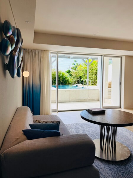 The Garden Junior Suite features a 67-square-meter room accompanied by a 42-square-meter private garden with its own swimming pool, offering an exceptional sense of seclusion. Since children under 12 may use the main pool only until 5:00 p.m., families with elementary-school-aged children who want to enjoy swimming without watching the clock may find these private-pool rooms particularly appealing.