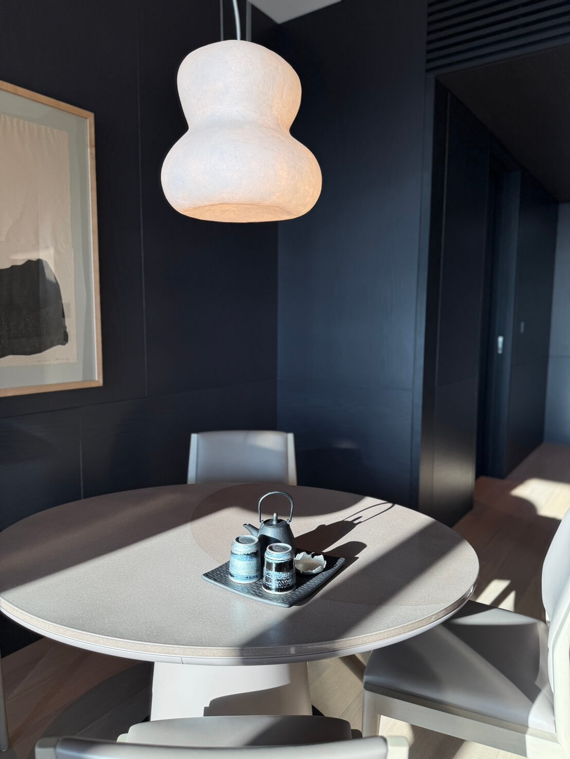 ランプシェードに関しては、モダンさとアジアの雰囲気を兼ね備えた、黒いワイヤーで編まれたシェードも印象的でした。共用部の廊下やお化粧室にあるので、是非注目してみていただければと思います。