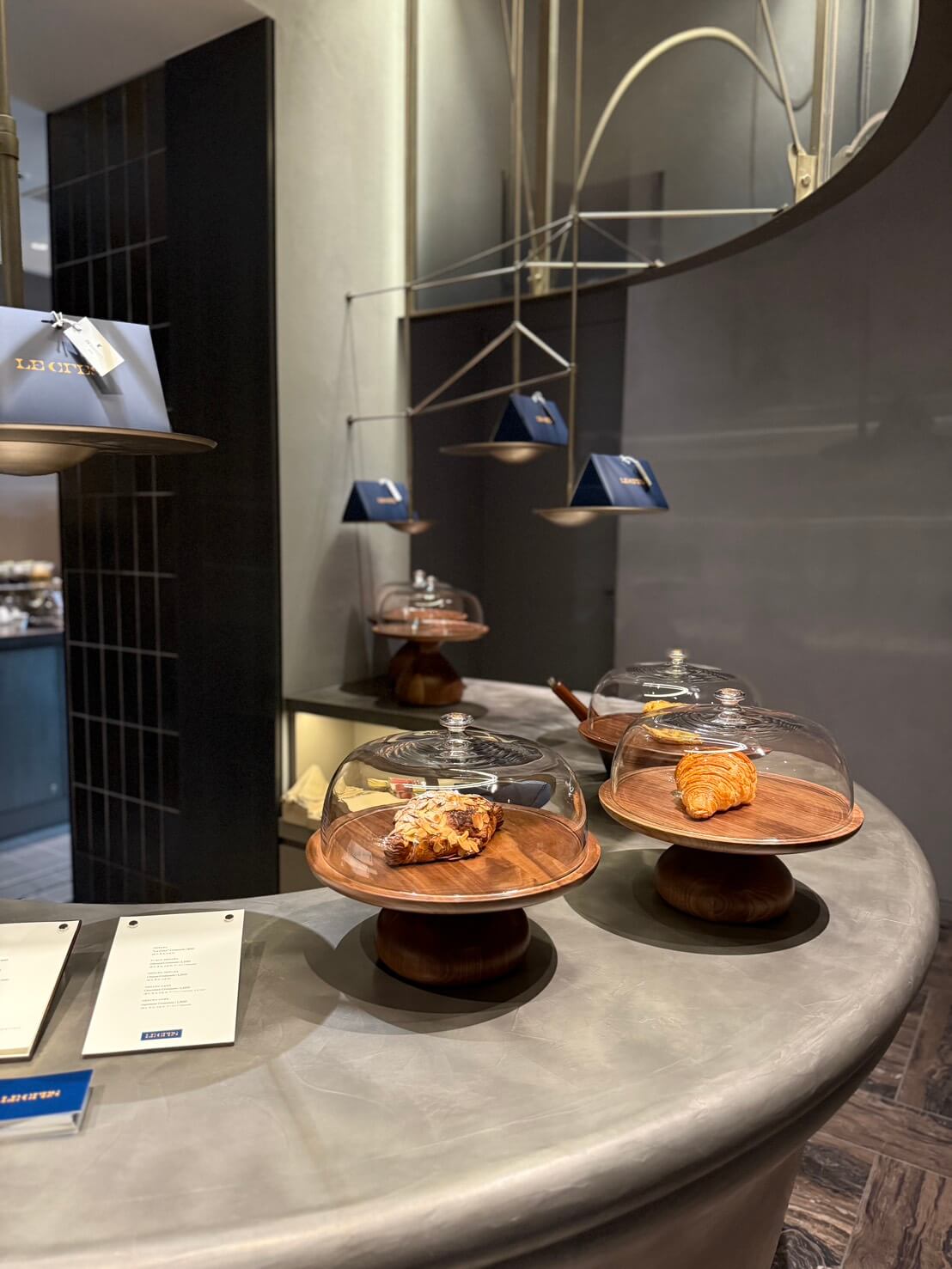 エントランスは30階。エレベーターを降りると目に入るのがクロワッサン・カフェの「Le Cres」。数テーブルほどの小さな空間ですが、ラウンジに入るほどでもないちょっとした時間を過ごすニーズ、小腹を満たすニーズ、そしてお土産のニーズも満たしてくれる、スマートなアレンジメントです。