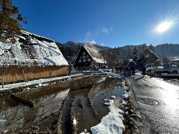 最後に、県境を越えて白川郷へ向かいます。この日は年末だったのですが、白川郷の駐車場に向かう道路が、集落の少し手前からとんでもない大渋滞。そこは観光地をよく知るドライバーさん、私たちを集落まですぐのところで下ろしていただき、周遊しているあいだに車は駐車場へ向かっておいていただく、という効率的なプランをご提示いただきました。