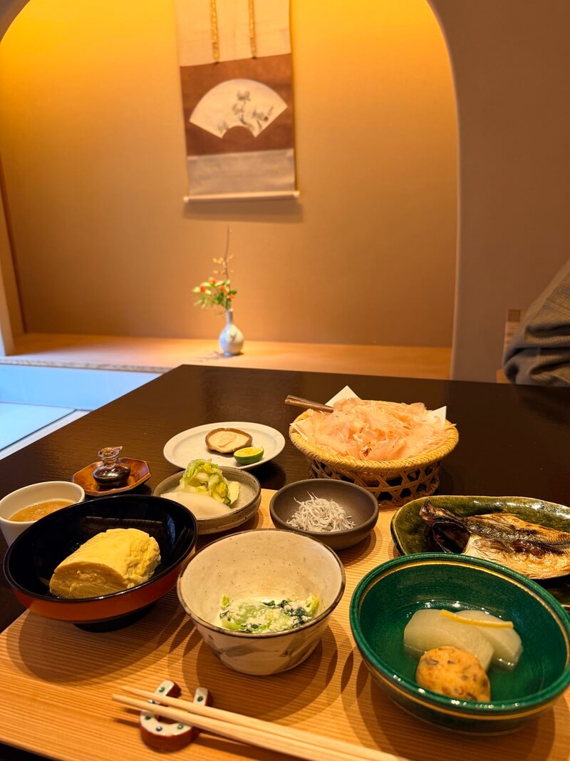 Breakfast featured glossy rice topped with ultra-thin shaved bonito from Yaizu and fresh wasabi from Amagi, winter-only charcoal-grilled shiitake mushrooms, and a delicately textured rolled omelet that proved unexpectedly addictive. In the southern light streaming through the windows, soaking once more in the in-room bath after breakfast felt like quiet indulgence.