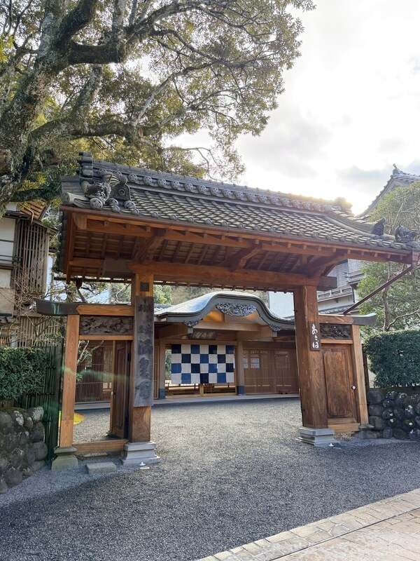 It was during this period of revival, in 1484, that Asaba was founded. Asaba Yakuro Yukitada opened a lodging for temple visitors at the temple gate. The ryokan stands just a five-minute walk from Shuzenji. After visiting the temple, I strolled past the Katsura River and along a path lined with bamboo before the ryokan’s stately gate comes into view. Beneath the curved karahafu roof, a noren curtain—created by Izu Oshima-based textile artist Takumi Sugawara—hangs gently and is changed with the seasons.