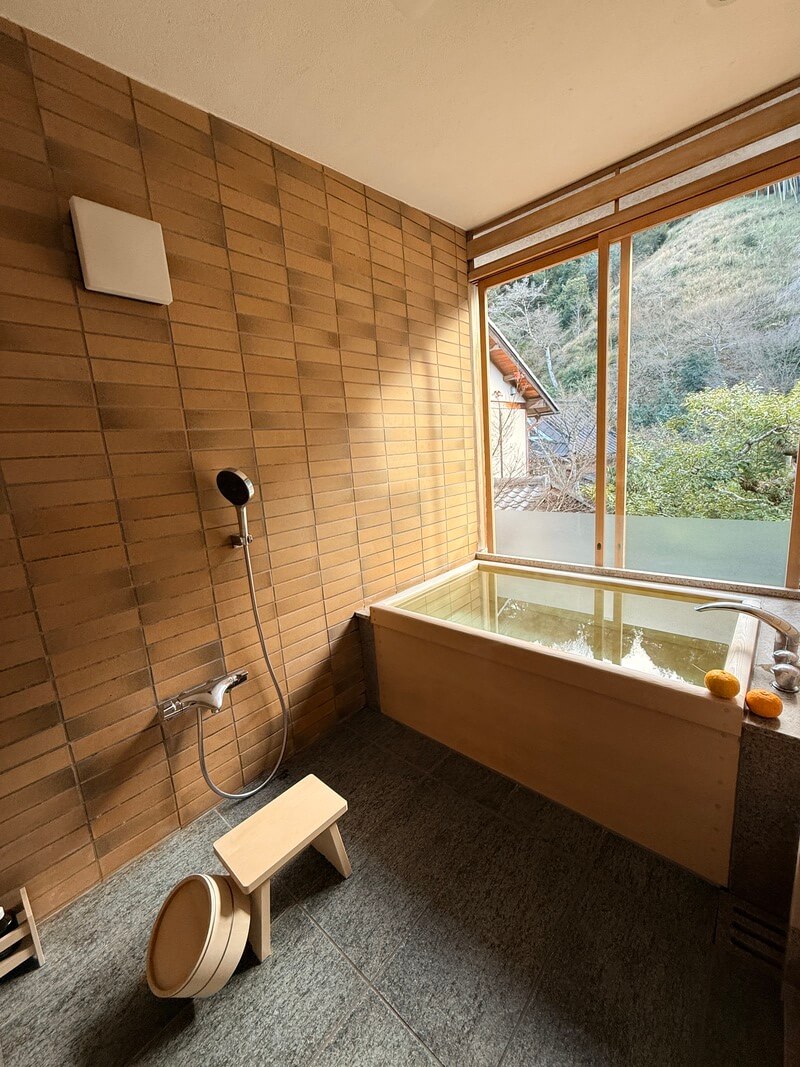The in-room bath is supplied directly from the hot spring source. Upon arrival, the cypress tub was already filled to the perfect temperature. From late November through the end of the season, yuzu baths are offered, and two glossy, fragrant yuzu floated at the edge of the tub. Perfectly round and unblemished, they reflected the ryokan’s refusal to compromise, even on what might seem a small detail.